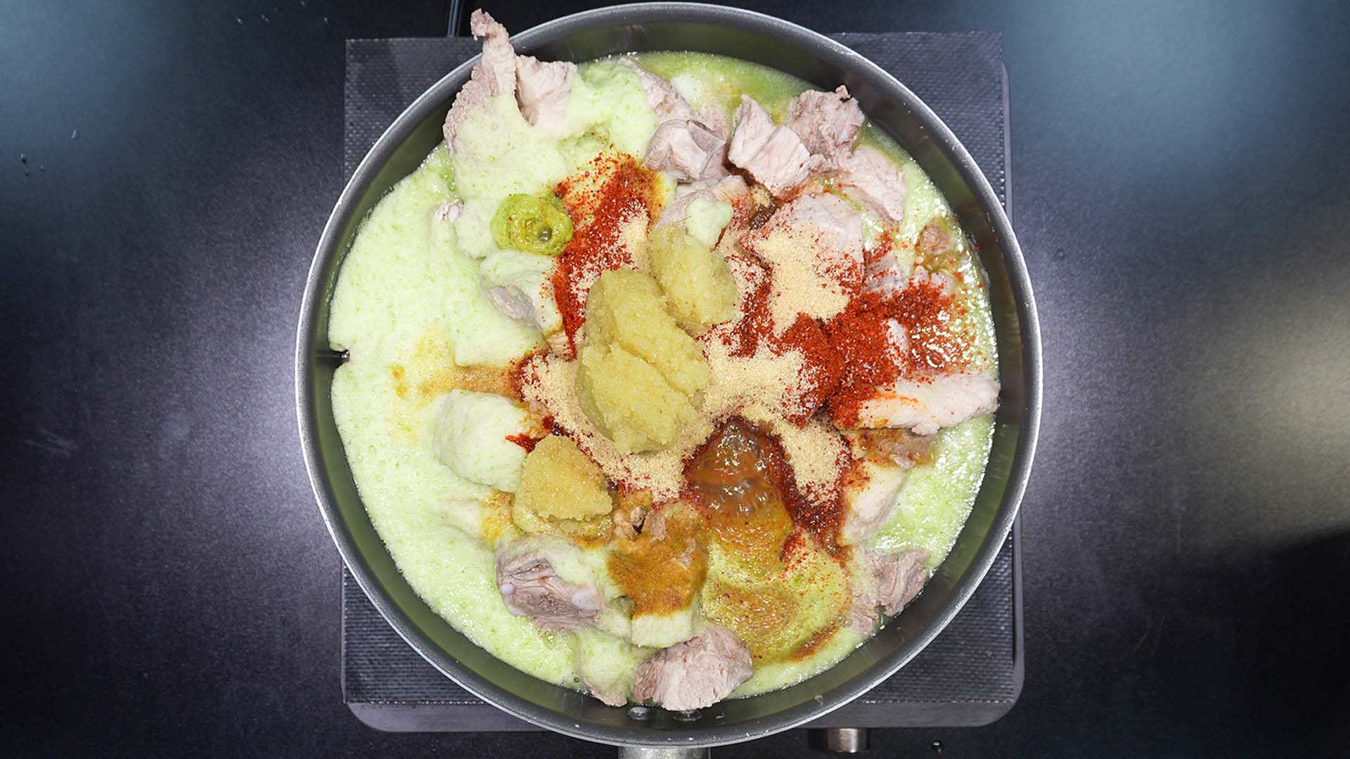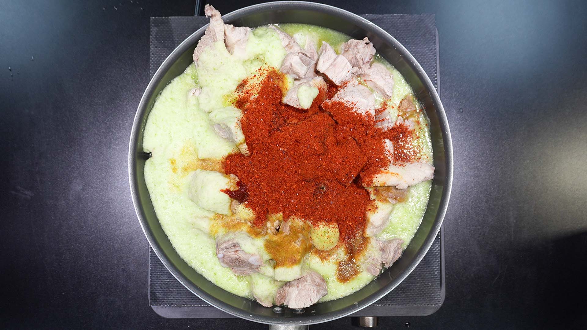 6) 고춧가루를 냄비에 넣어준다