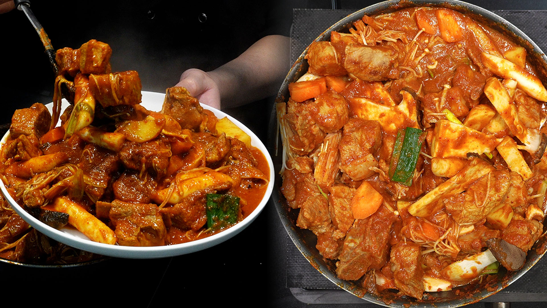22) 접시 위에 매운 돼지갈비찜을 덜어준다