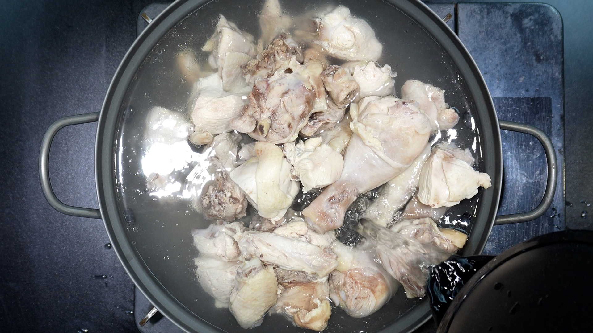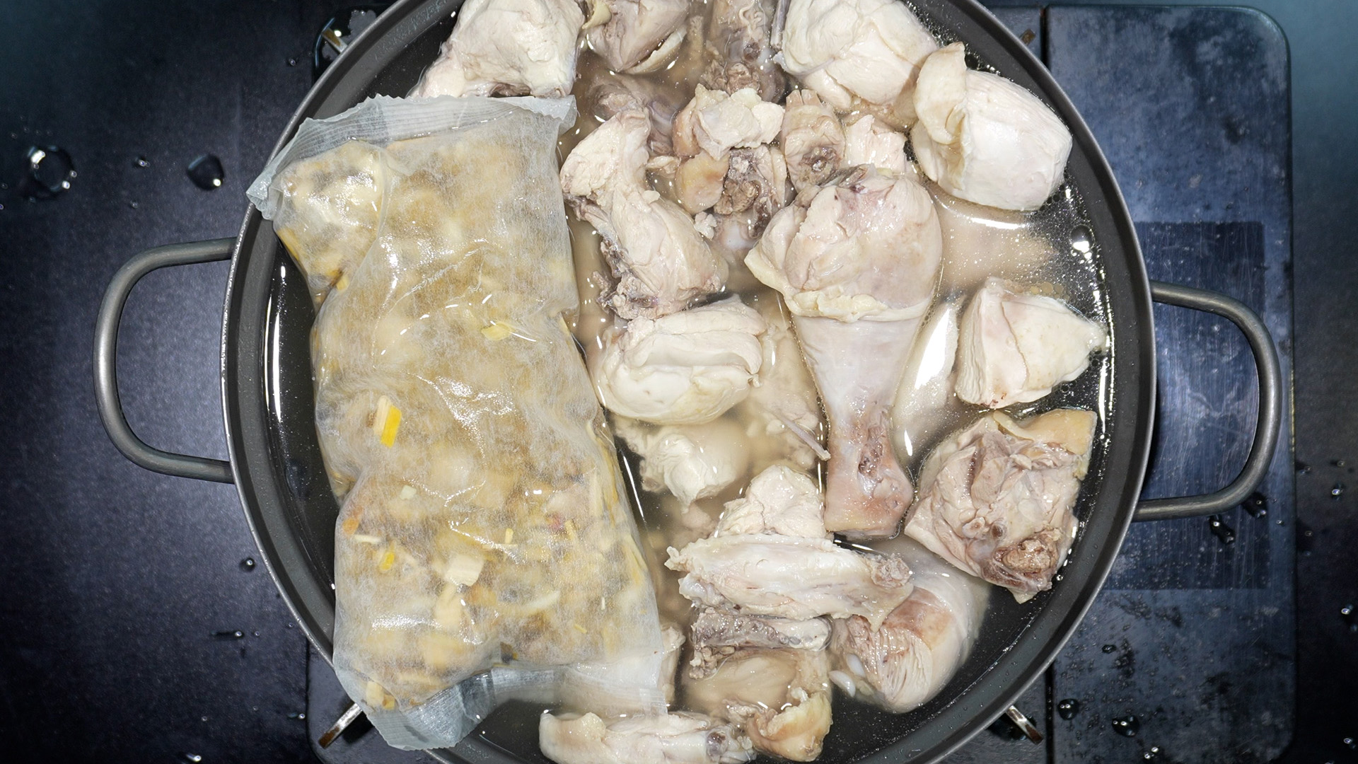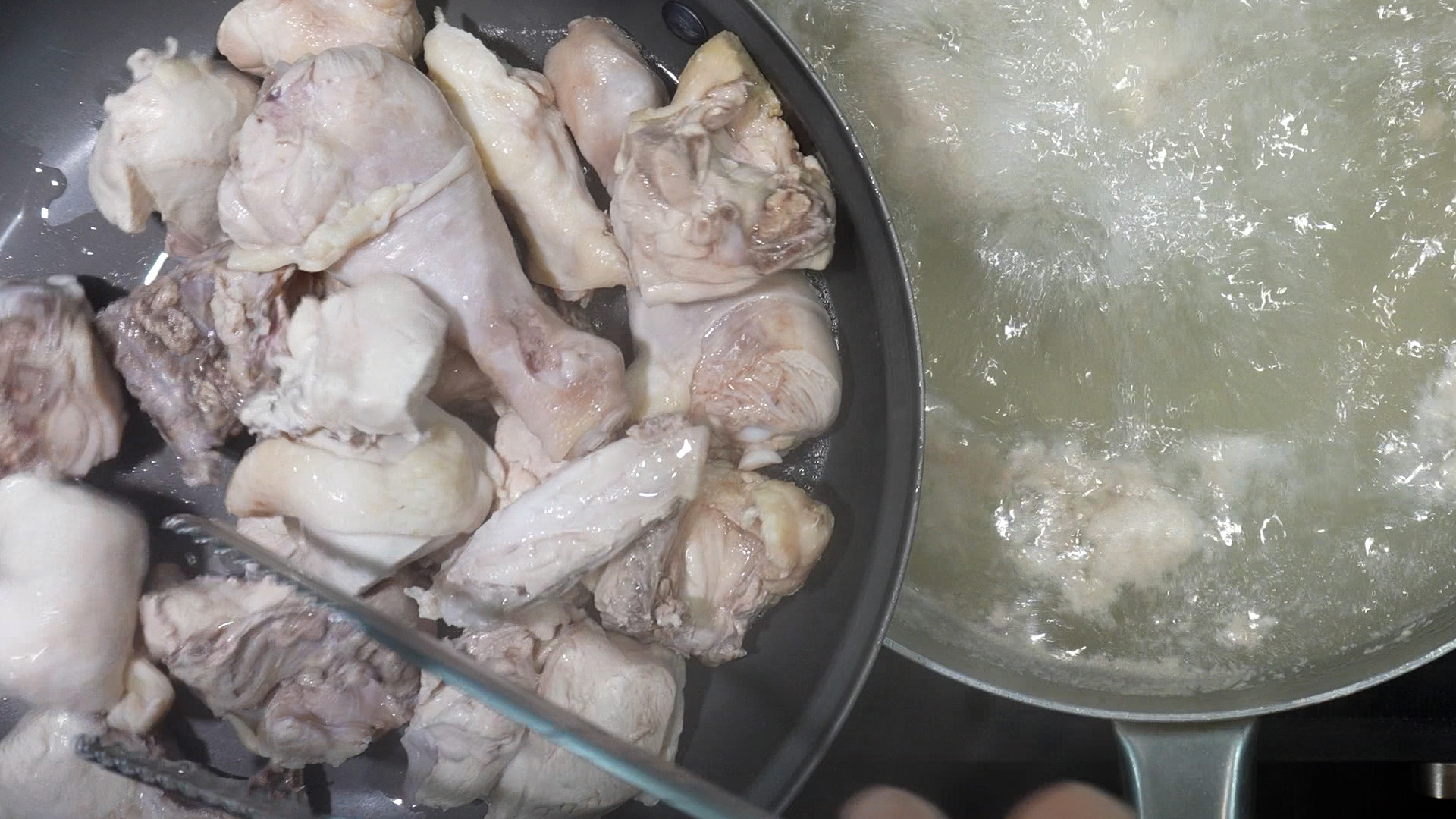 2) 끓는 물에 닭을 넣는다.
