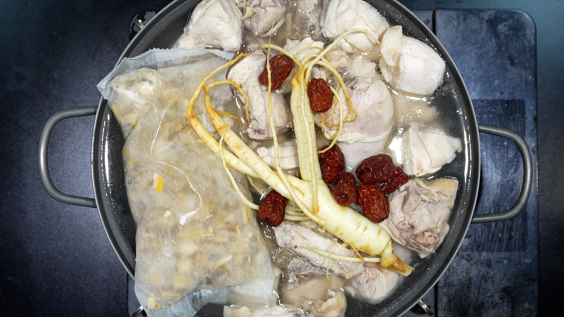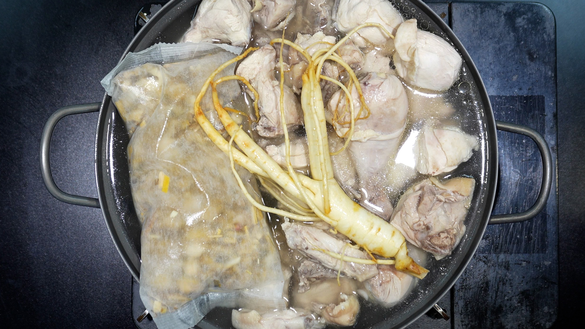 8) 삼계탕 팩을 넣는다.