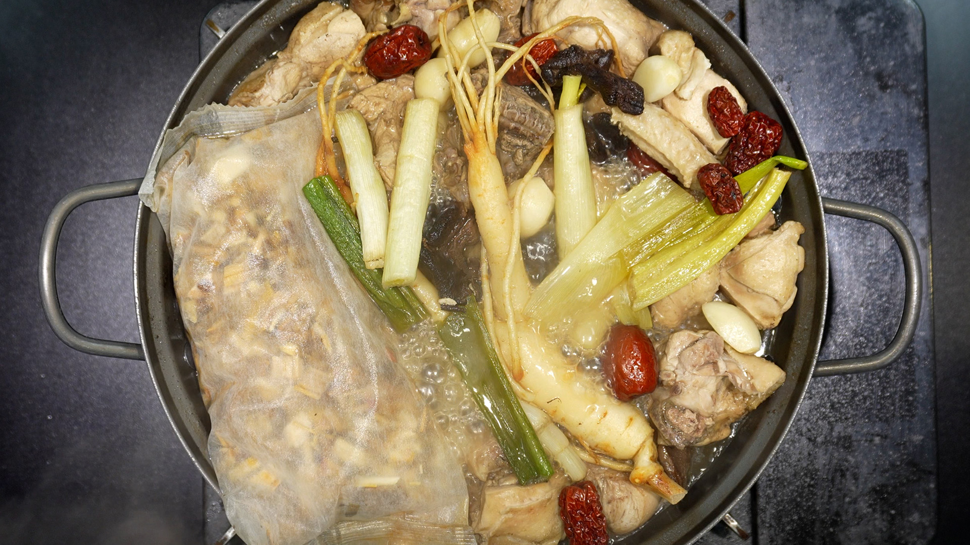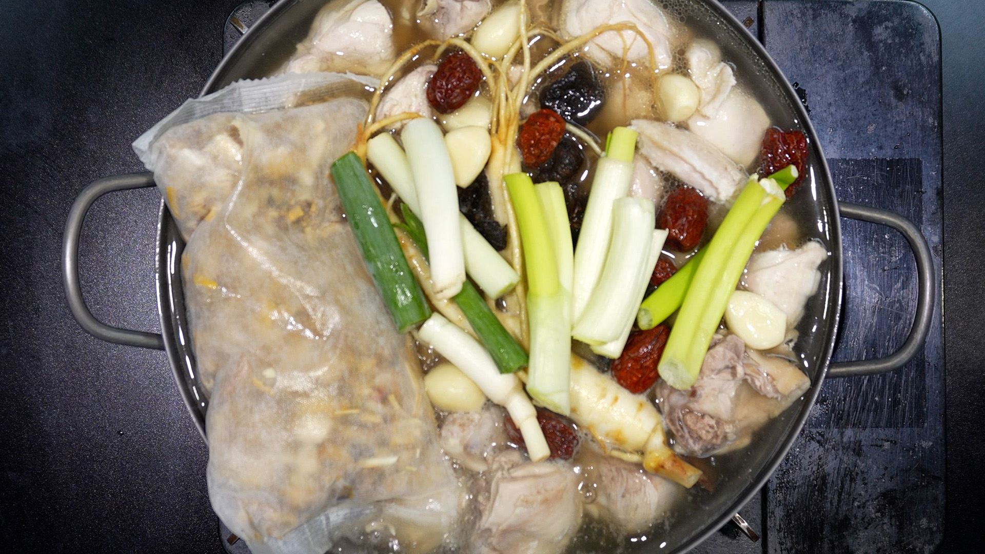 15) 30분 뒤, 삼계탕 팩, 수삼, 대추, 대파를 건져준다. (못 먹는 재료들)