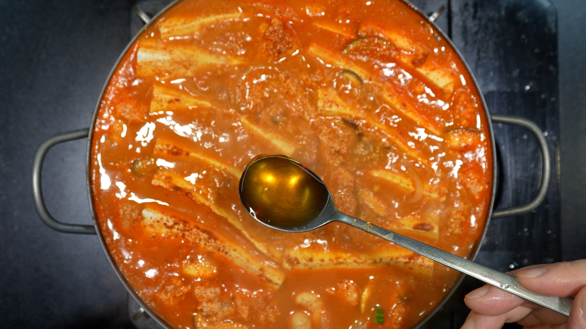 > 국물 많은 게 좋다면 똑같이 물을 한 컵 부어주고, 자작한 게 좋다면 사골곰탕까지만 넣어준다.