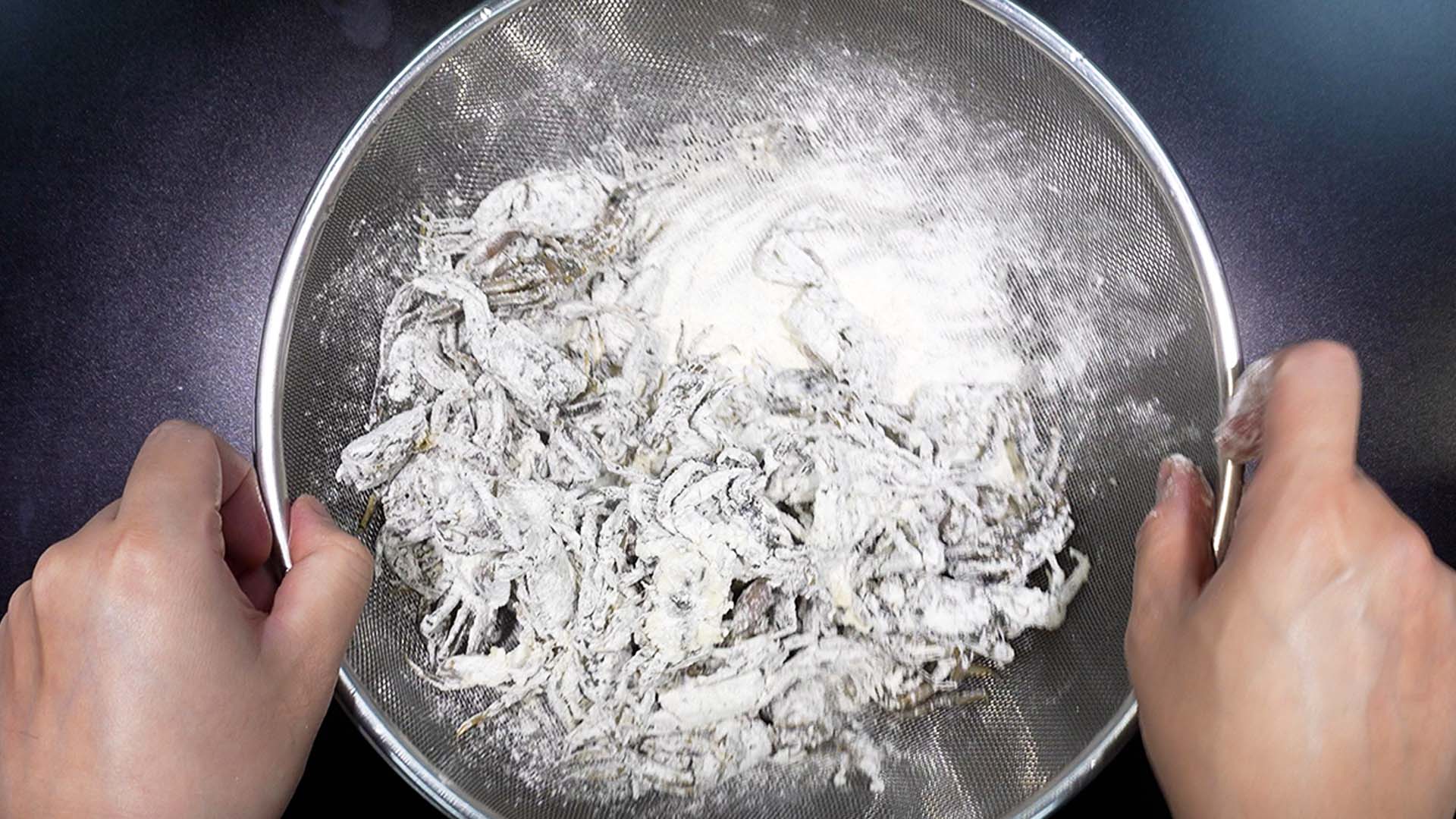 1) 칠게에 튀김가루를 부어준다