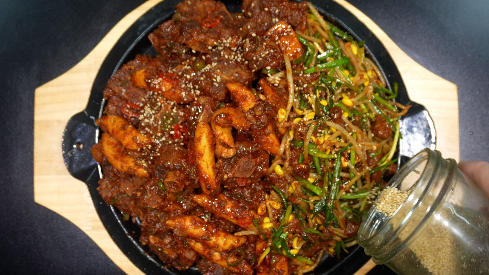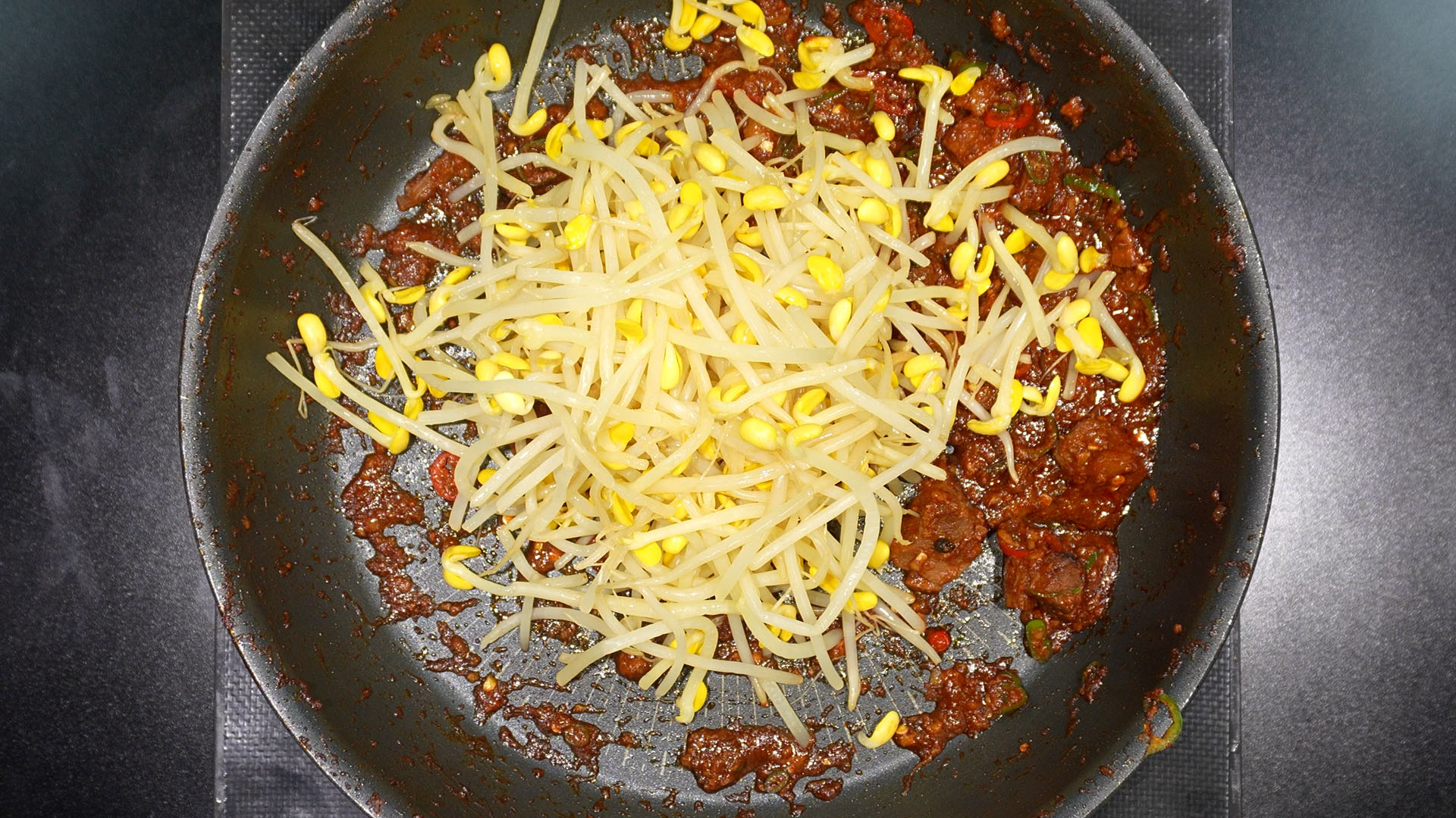 1) 소꼬리찜 양념에 데친 콩나물을 넣는다.