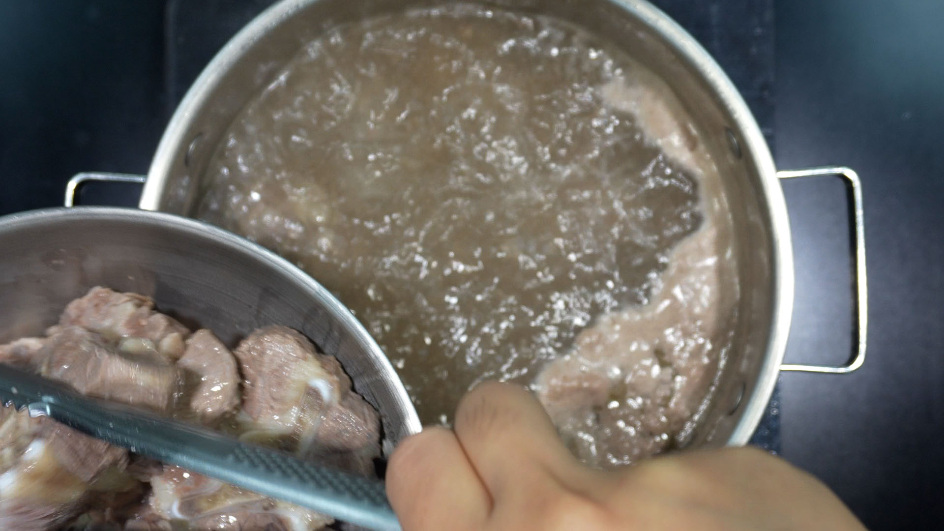 1) 끓는 물에 소꼬리를 넣는다. (뼈 부스러기 제거, 핏물 빼기를 같이 할 수 있다.)