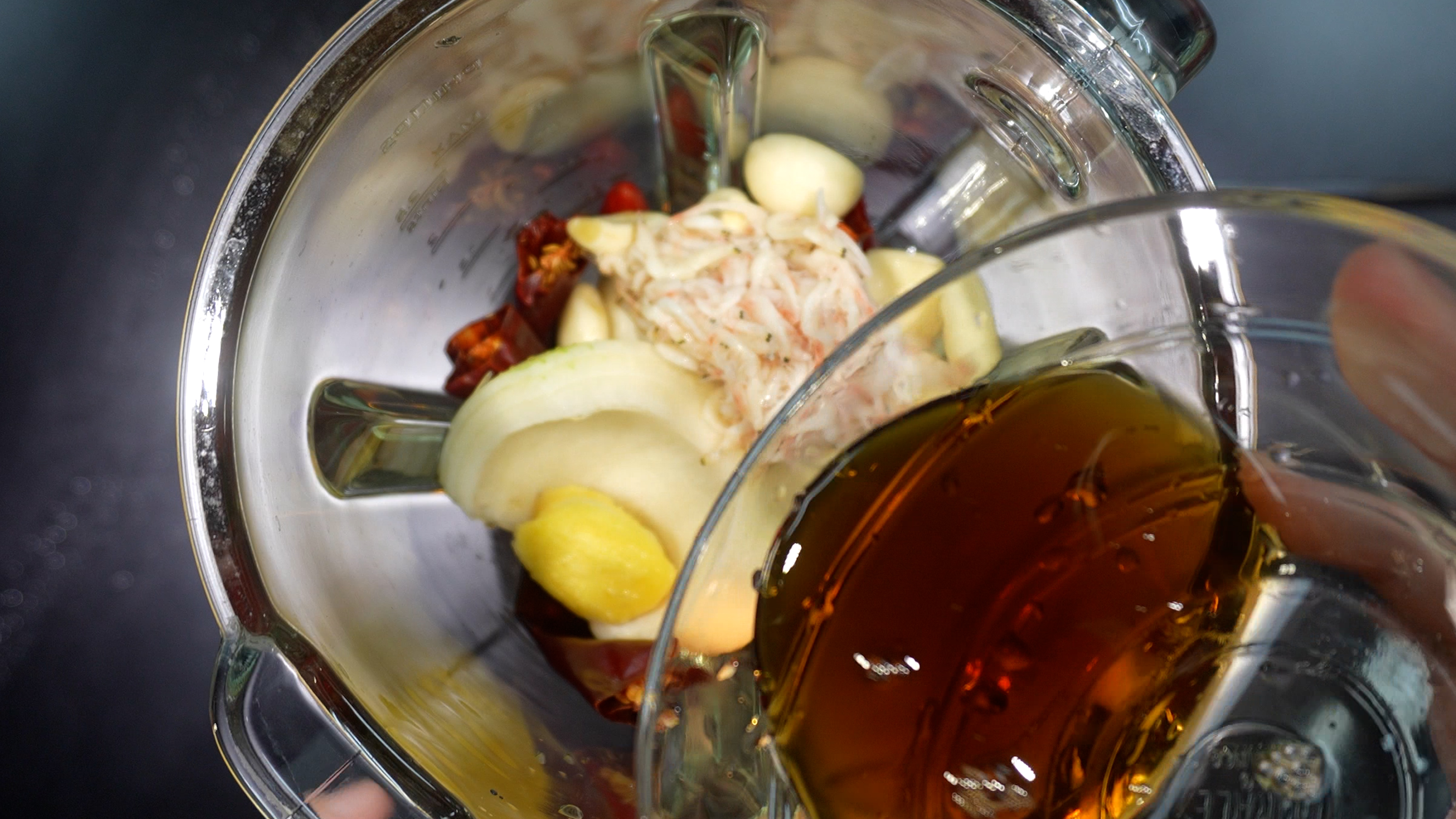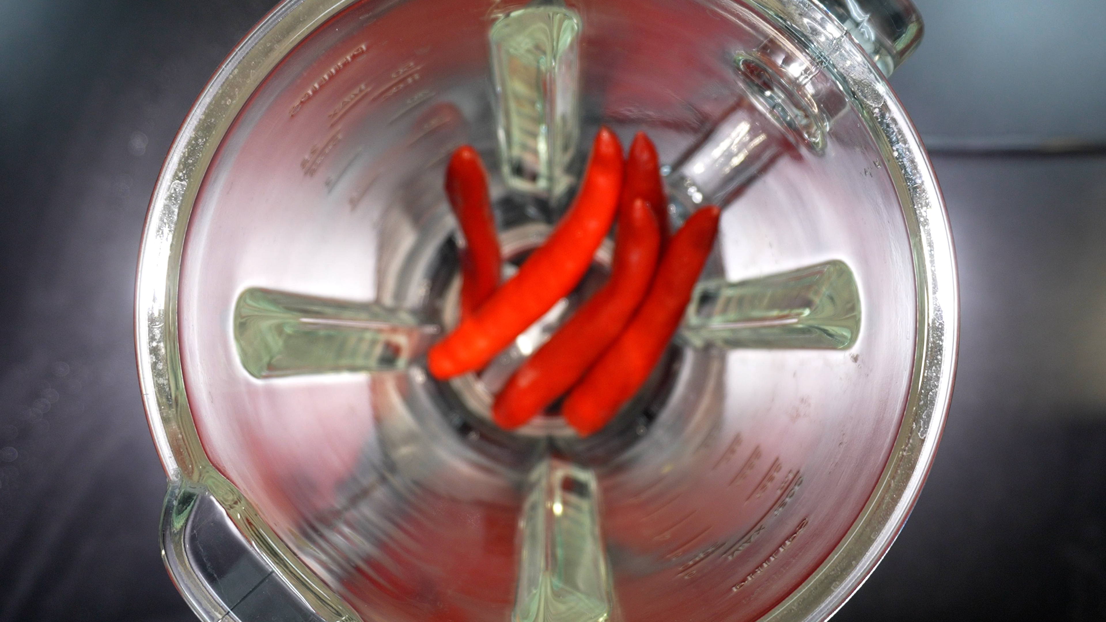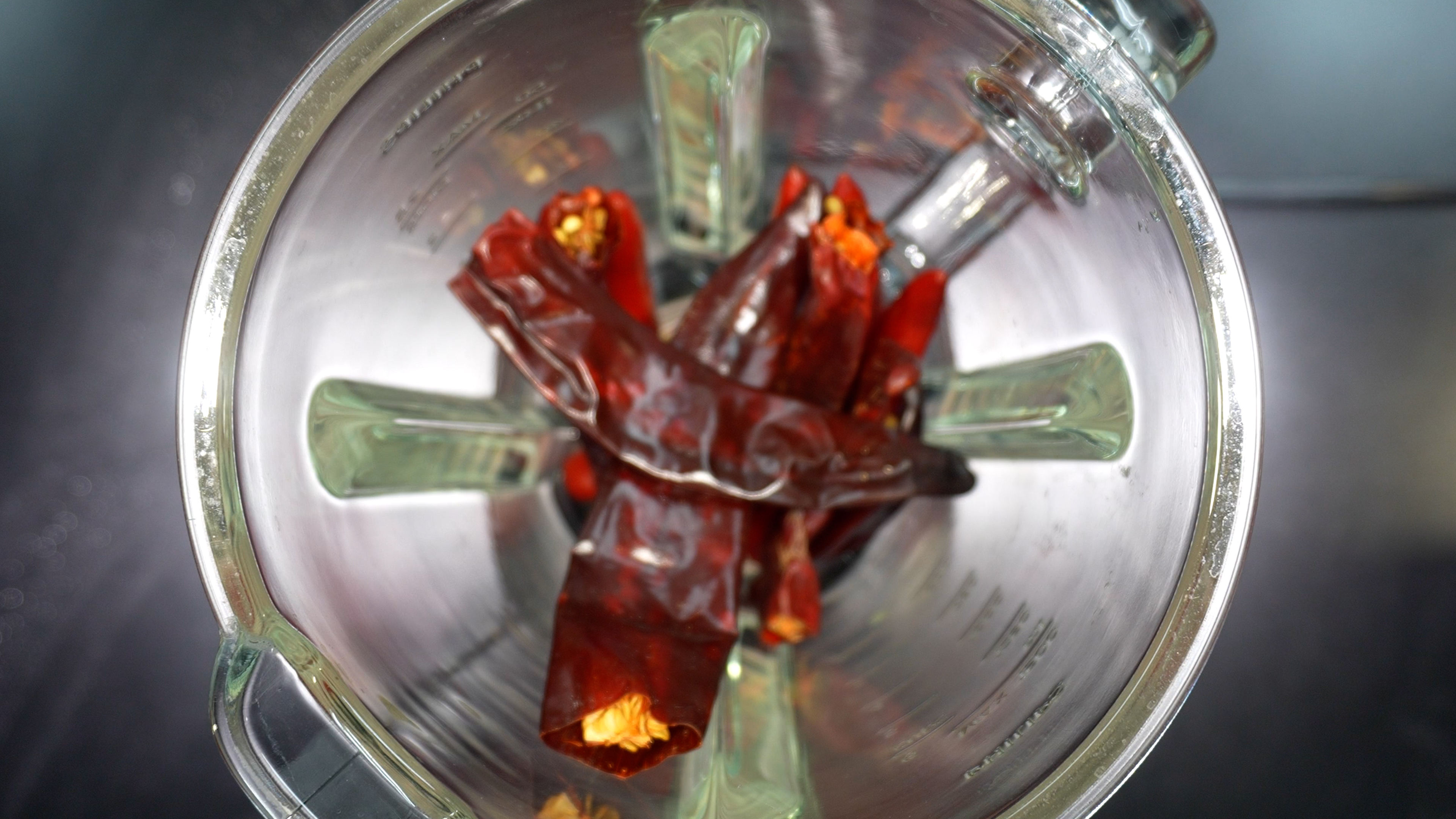2) 믹서기에 홍고추를 넣는다.