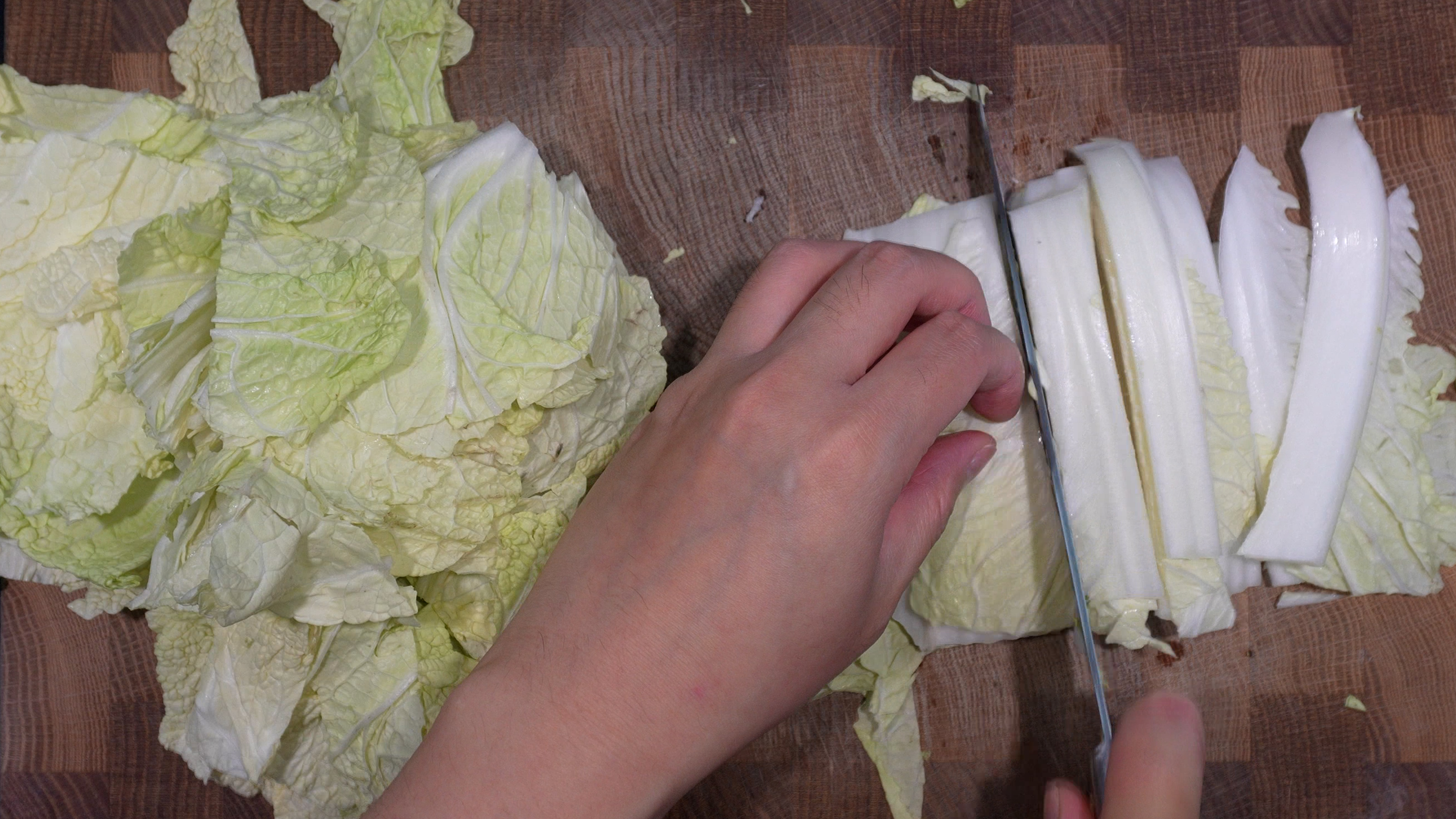 3) 삼등분한 배추의 얇은 이파리는 크게 썰어주고,