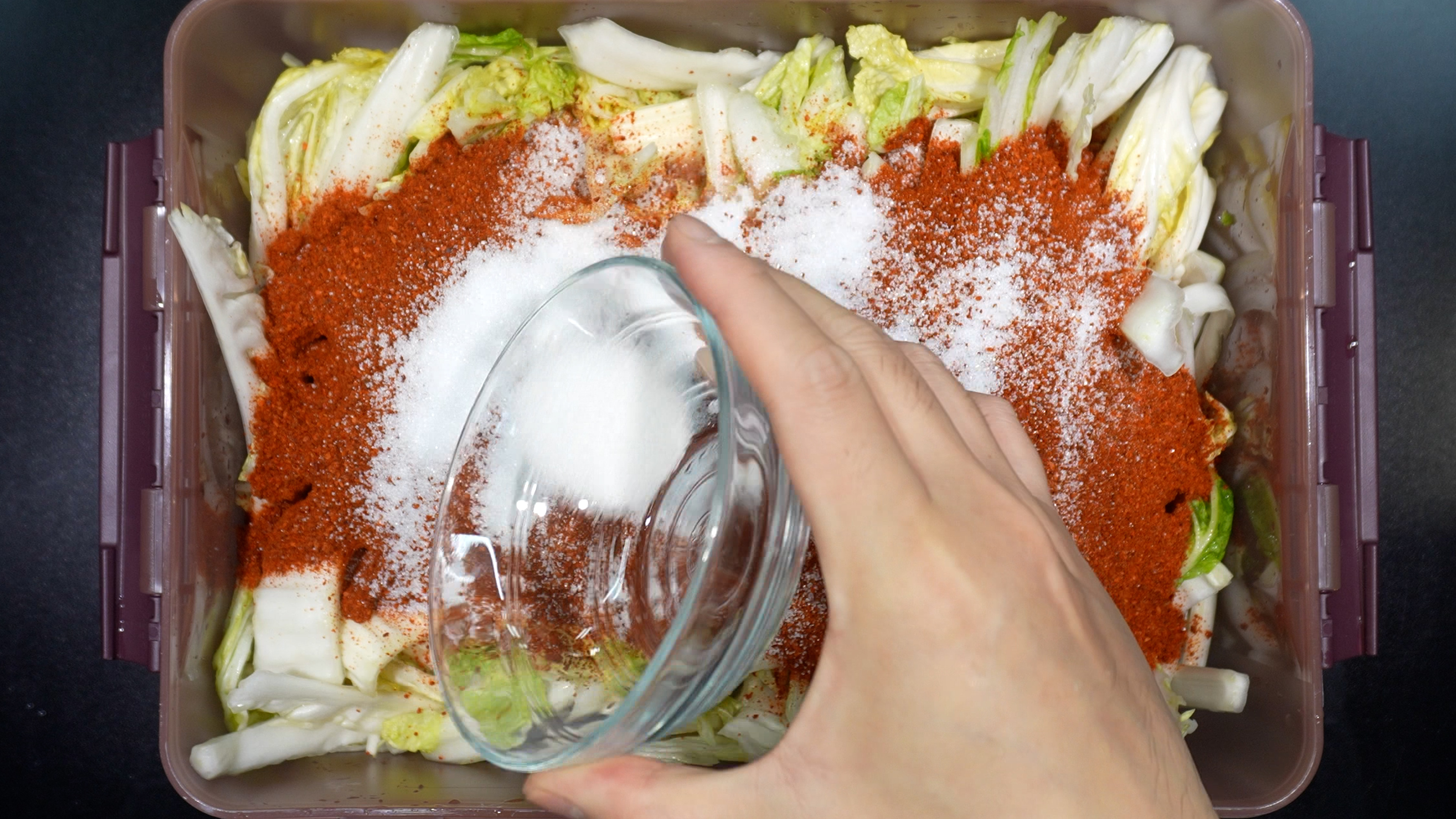 7) 배추를 담은 통에 아까 녹인 소금물을 부어준다.