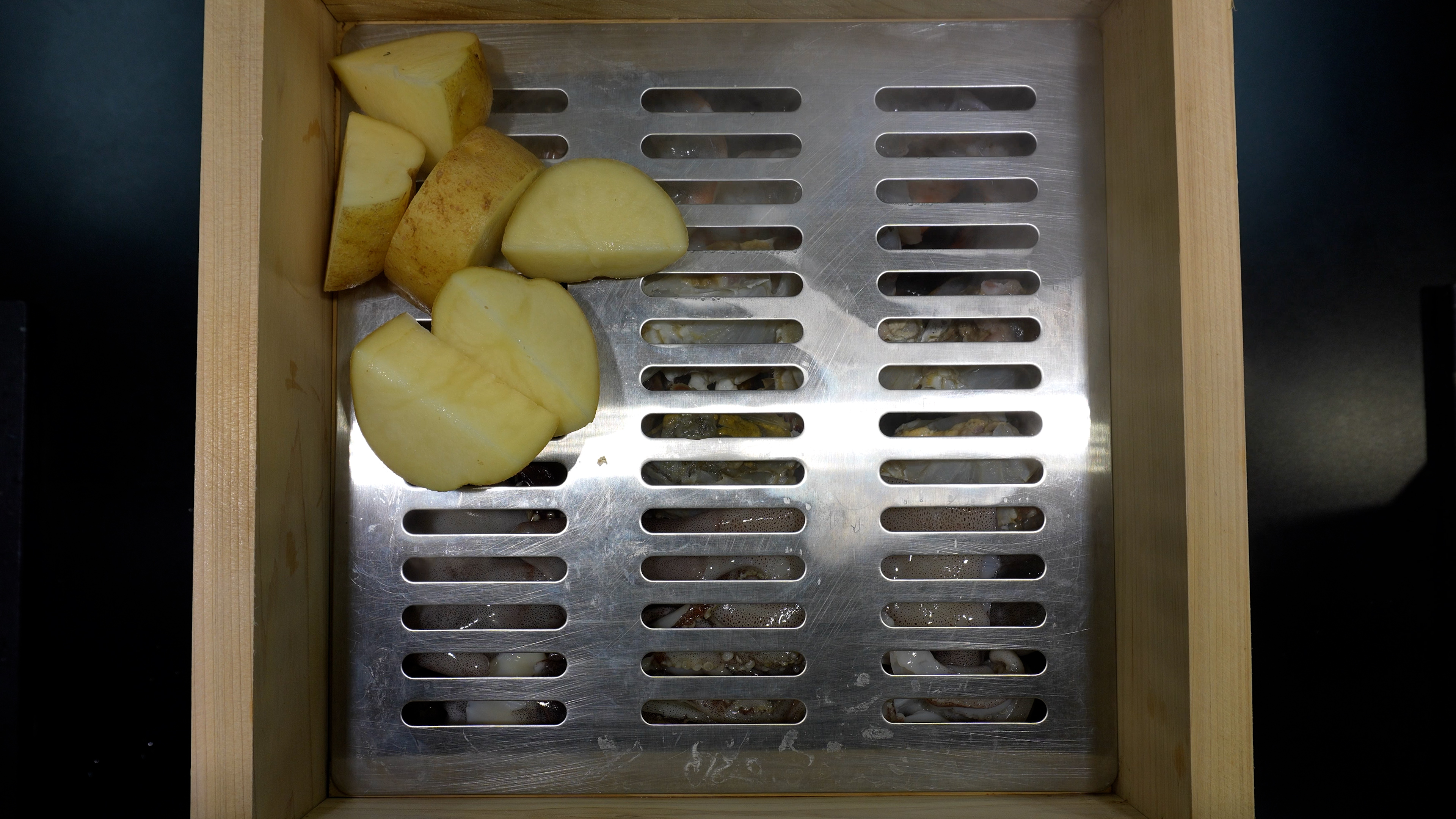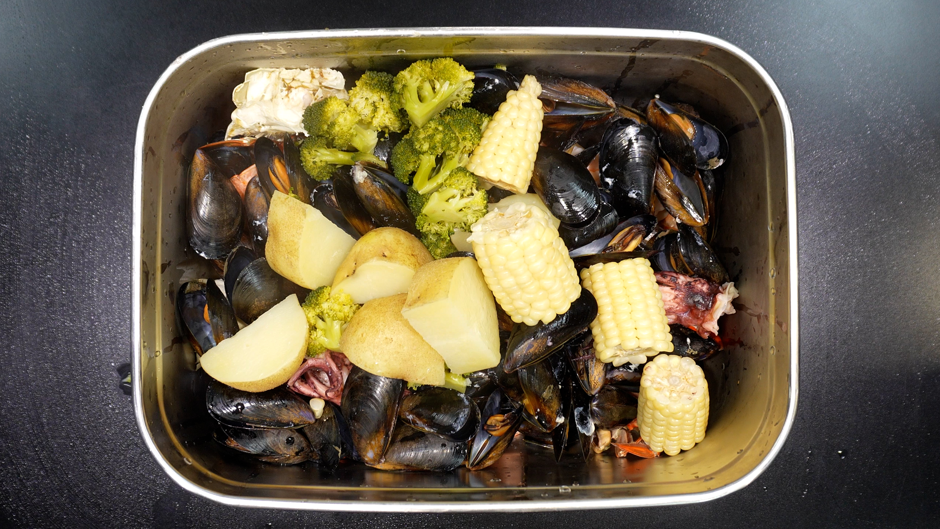 1) 스테인리스 김치통에 찐 해산물을 넣는다.