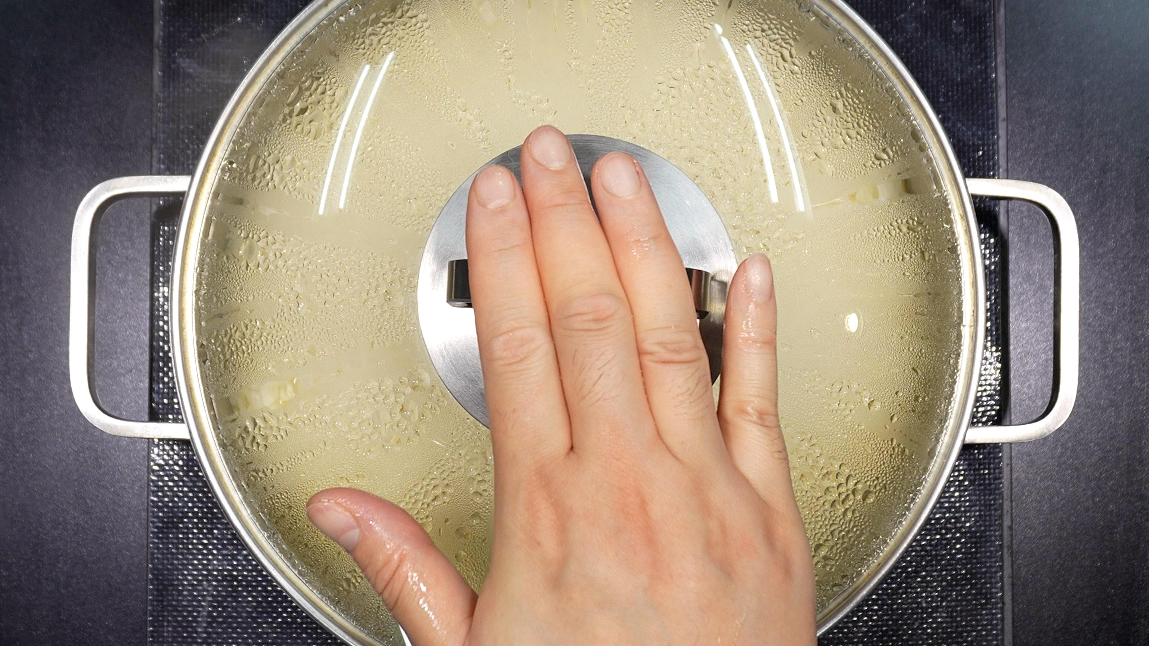 1) 15분 후 불을 끄고, 뚜껑을 덮은 상태에서 10분간 뜸을 들여준다.