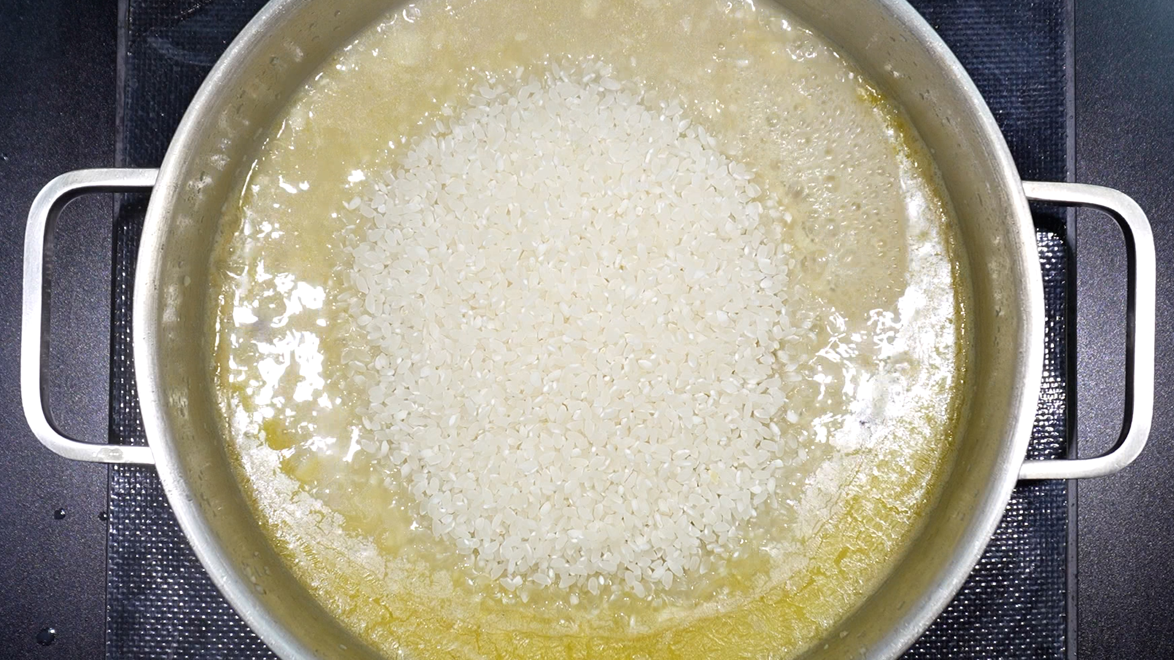 1) 백합을 조리하던 팬에 쌀을 넣는다.